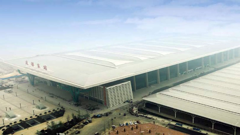 成都火車東站位于成都市東三環(huán)路,2010年開始建設(shè),車站面積約22萬平方米。在設(shè)計(jì)上引入了大量的文化元素,東、西廣場的進(jìn)出口都用了三星堆的青銅面具元素,屋頂引入了金沙太陽神鳥的火焰造型,被定為一等客運(yùn)站。使用了寶鋼鍍鋁鋅