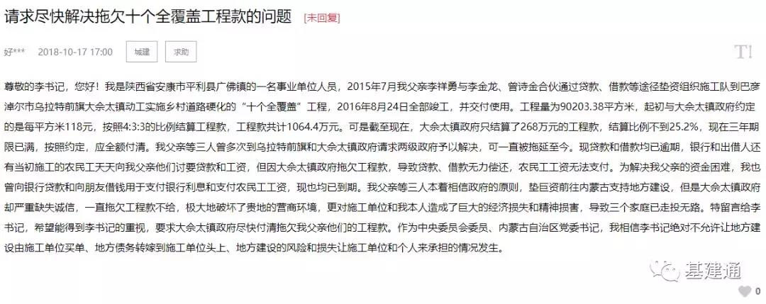 一名在內(nèi)蒙古支援建設(shè)的網(wǎng)友發(fā)帖求助,2015年網(wǎng)友承接了鄉(xiāng)村道路硬化工程,工程款共計1064.4萬元。2018年工程竣工并交付使用后,政府只結(jié)算了268萬元。網(wǎng)友在留言中表示,“政府拖欠工程款,導(dǎo)致貸款、借款無力償還,農(nóng)民工工資無法支付。”