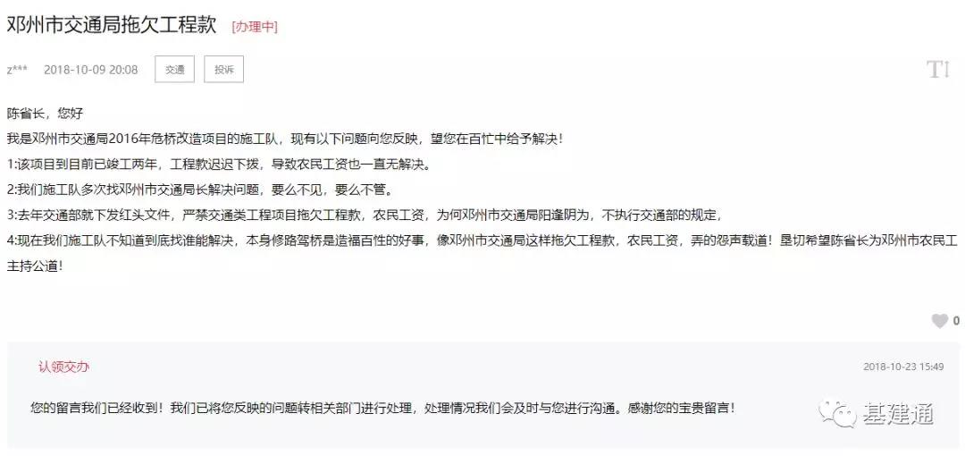 河南網(wǎng)友在2016年與政府簽定了危橋改造項(xiàng)目,工程款卻遲遲不下?lián)埽瑢?dǎo)致農(nóng)民工工資也一直沒有解決。